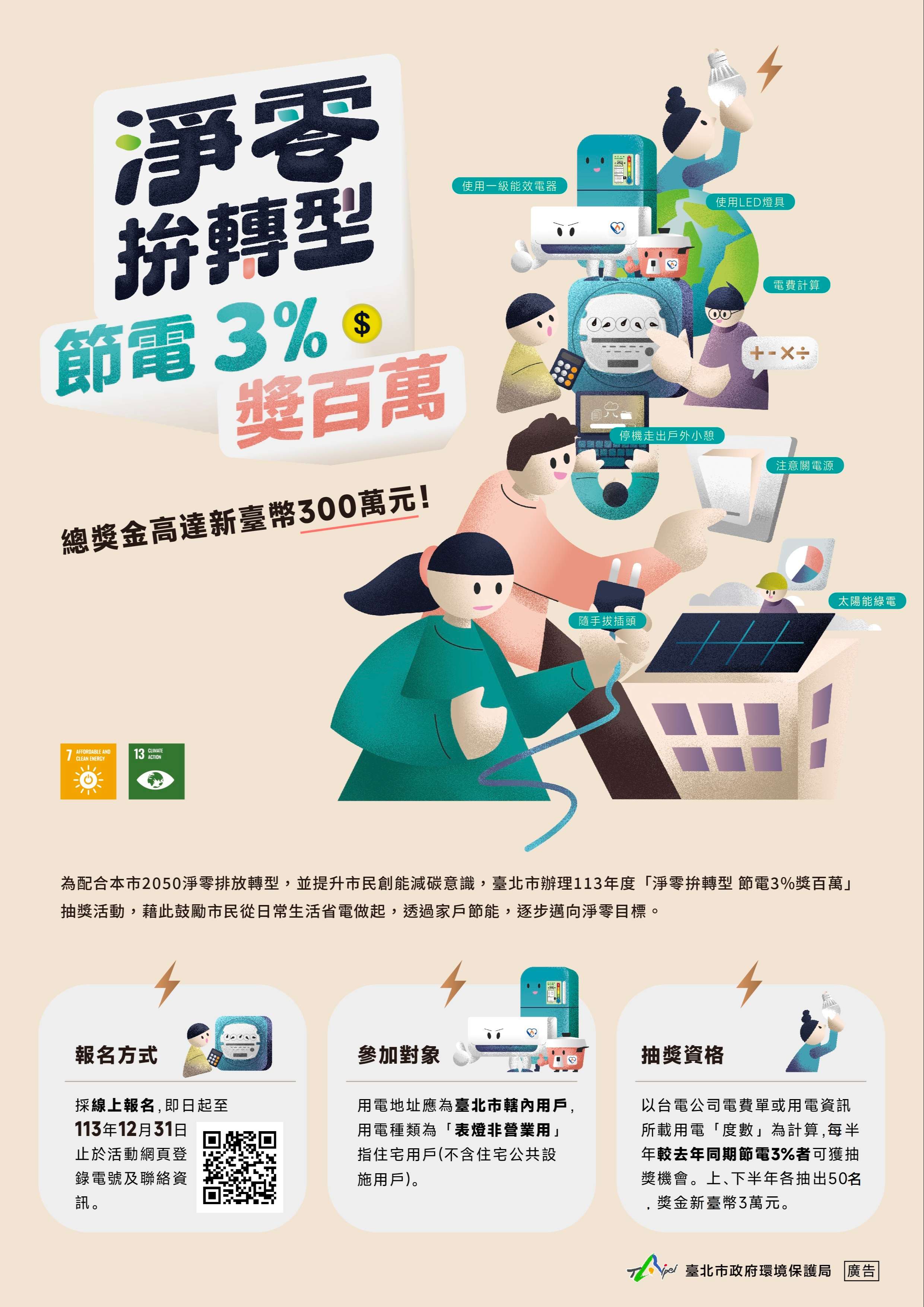 環境保護局為鼓勵市民落實節能減碳行動,即日起至 113年12月31日辦理「淨零拚轉型節電3%獎百萬」抽獎活 動,參加對象為臺北市轄內「住宅用戶」,每半年較去年 同期節電達3%即可參加抽獎,113上下半年各抽出50名,每名獎金新臺幣3萬元。