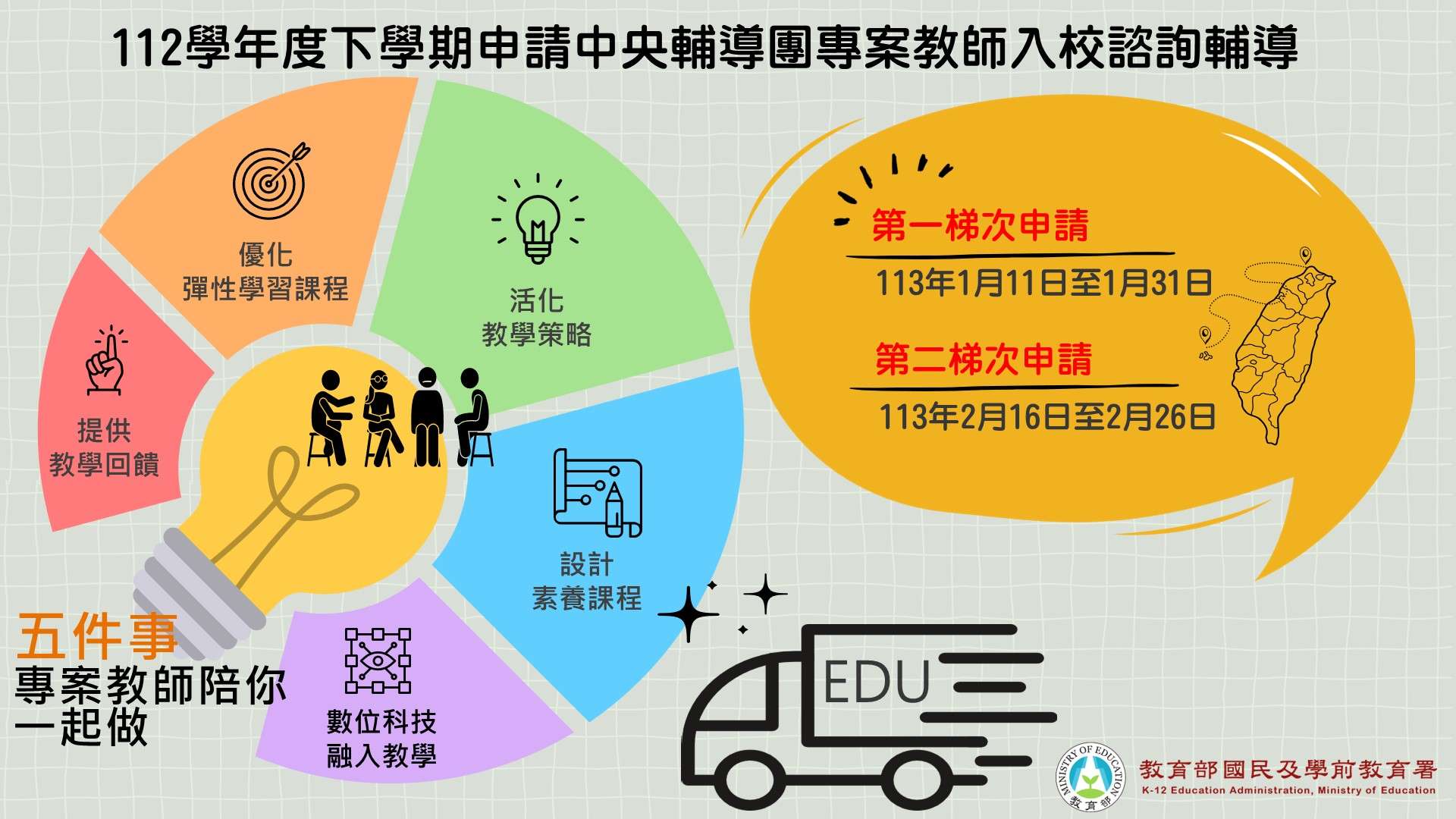 二、為推動新課綱素養導向之課程與教學,以培育具備核心素養能力之學生,本署規劃「112學年度中央課程與教學輔導諮詢教師團隊專案教師實施計畫」,學校可申請112學年度下學期中央輔導團專案教師到校陪伴(詳如附件說明),簡要說明如下: