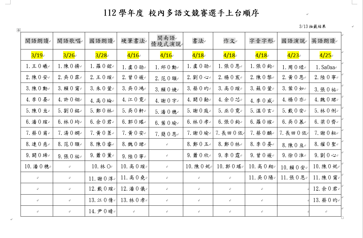 112學年度校內多語文競賽國語朗讀及英語朗讀選手上台順序修改,詳如附件,祝各位選手比賽順利!