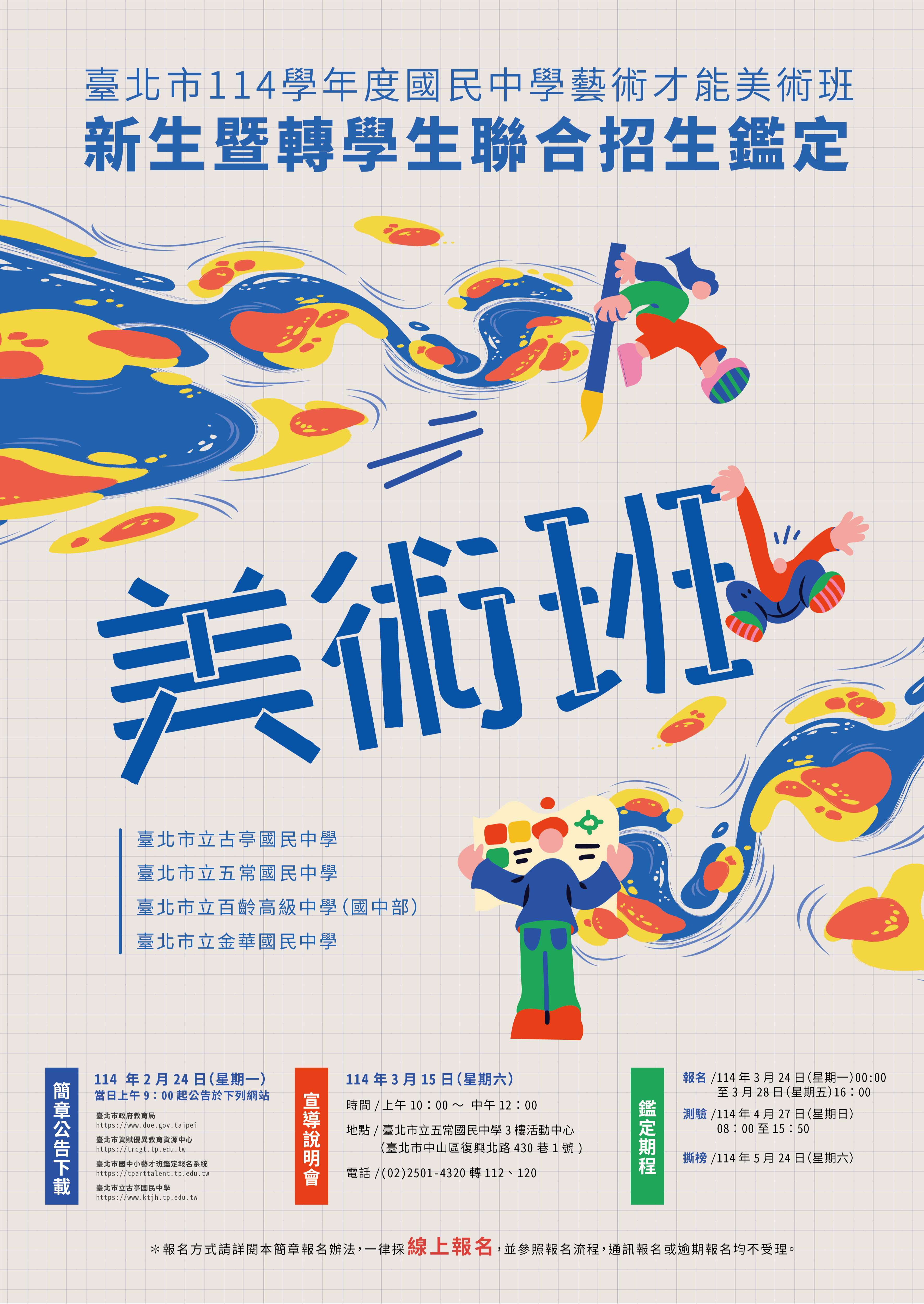 一、114學年度招生鑑定報名自114年3月24日(星期一)0:00至 3月28日(星期五)16:00,3月15日宣導說明會,4月27日 測驗,5月24日撕榜