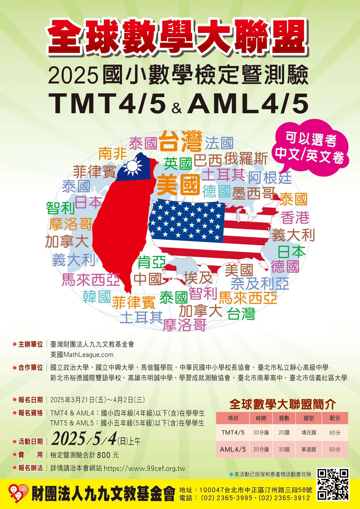 【轉知】九九文教基金會舉辦全球數學大聯盟 2025國小數學檢定暨測驗