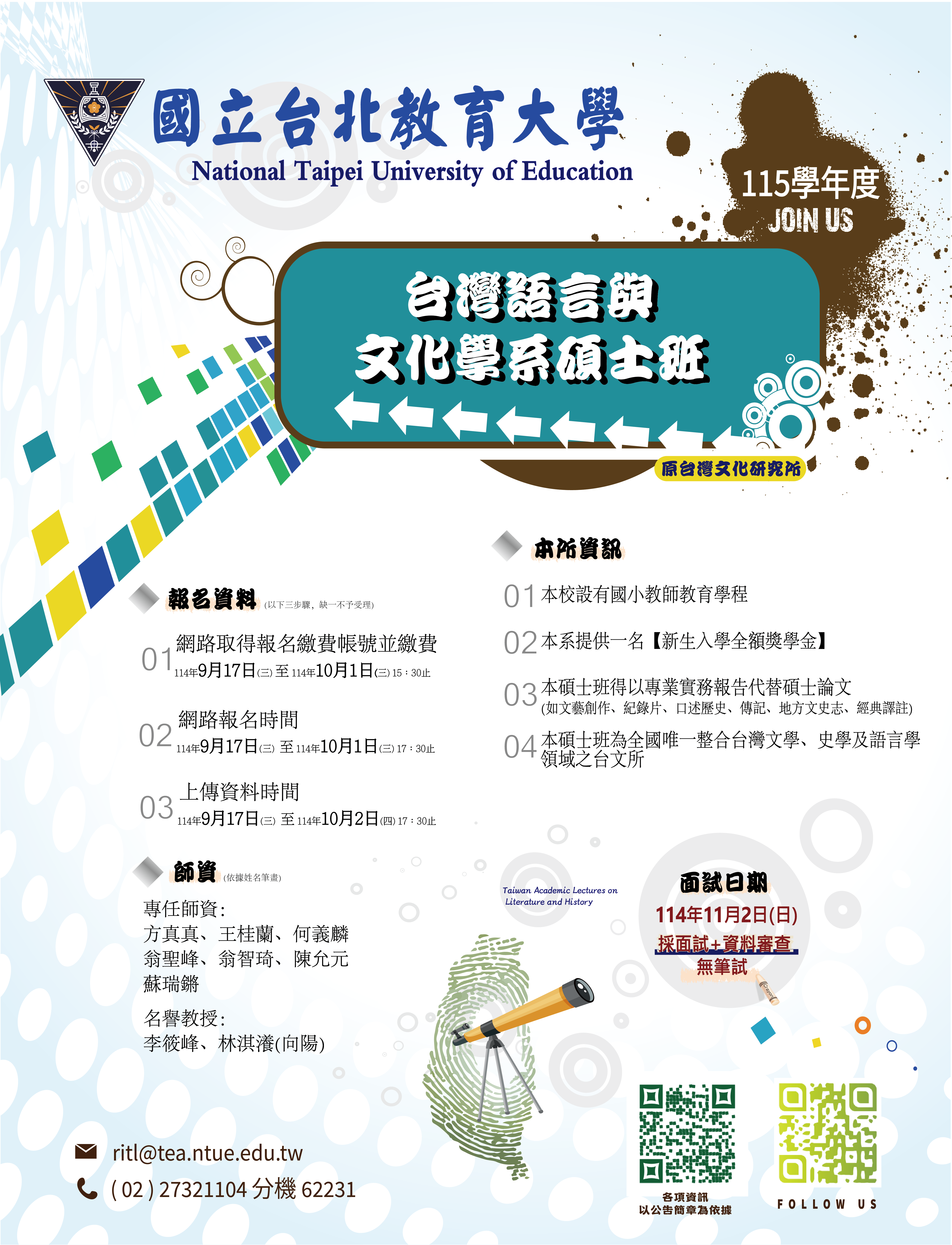 說明: 一、報考資訊: (一)網路取號繳費:114年9月17日(三)9:00至114年10月1日 (三)15:30止。 (二)網路報名填表:114年9月17日(三)9:00至114年10月1日 (三)17:30止。 (三)上傳資料截止時間:114年9月17日(三)9:00至114年10月 2日(四)17:30止。 (四)面試日期:114年11月2日(日)。 (五)招生名額:文學組8名、史學組8名。 (六)簡章下載:http://exam.ntue.edu.tw/index_E.html 二、聯絡人:陳雅芹(連絡電話:02-27321104 轉62231) 三、推薦甄試招生海報如附件。