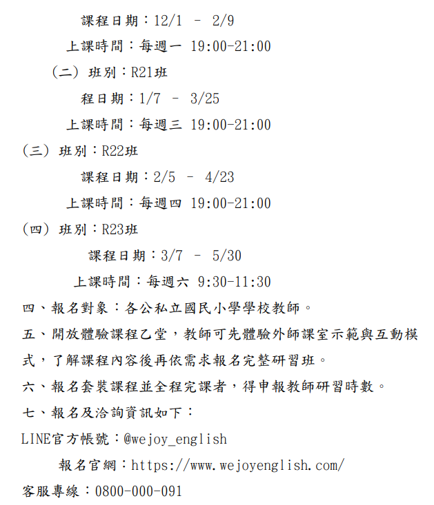 七、報名及洽詢資訊如下: LINE官方帳號:@wejoy_english 報名官網:https://www.wejoyenglish.com/ 客服專線:0800-000-091